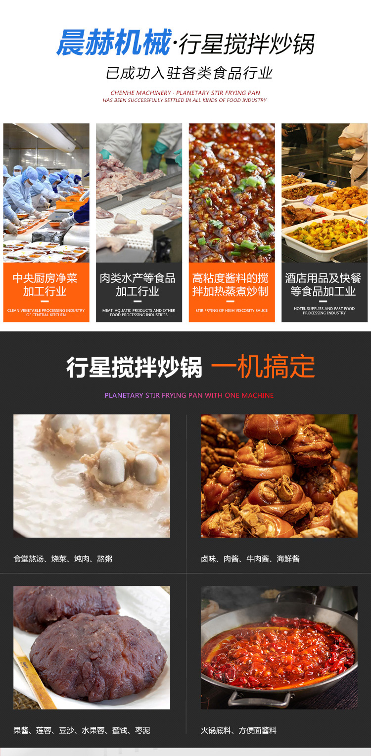 行星炒鍋、攪拌鍋、電磁炒鍋、蒸煮鍋、滾揉機(jī)、斬拌機(jī)、清洗風(fēng)干流水線等產(chǎn)品