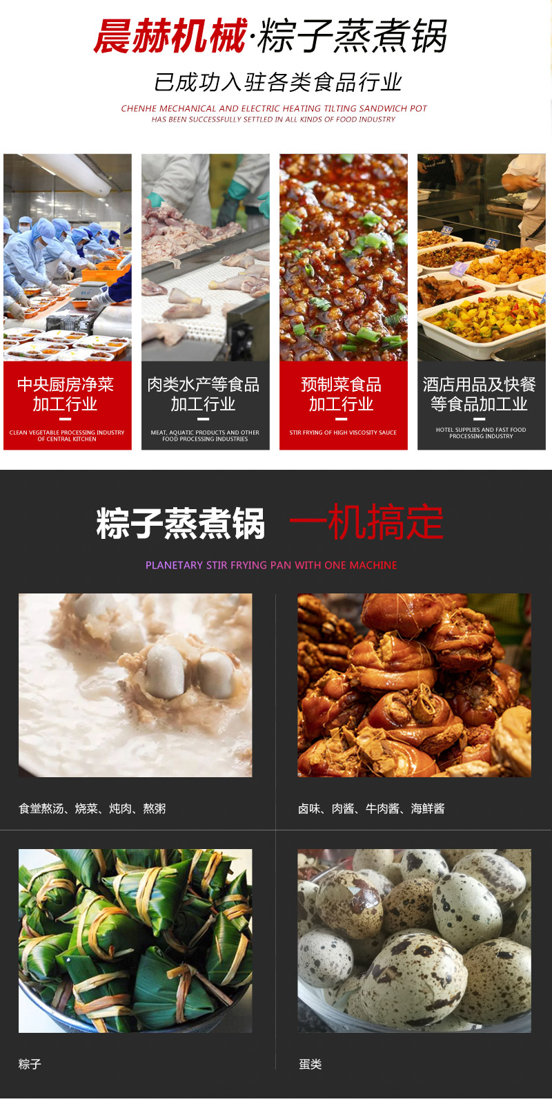行星炒鍋、攪拌鍋、電磁炒鍋、蒸煮鍋、滾揉機(jī)、斬拌機(jī)、清洗風(fēng)干流水線等產(chǎn)品